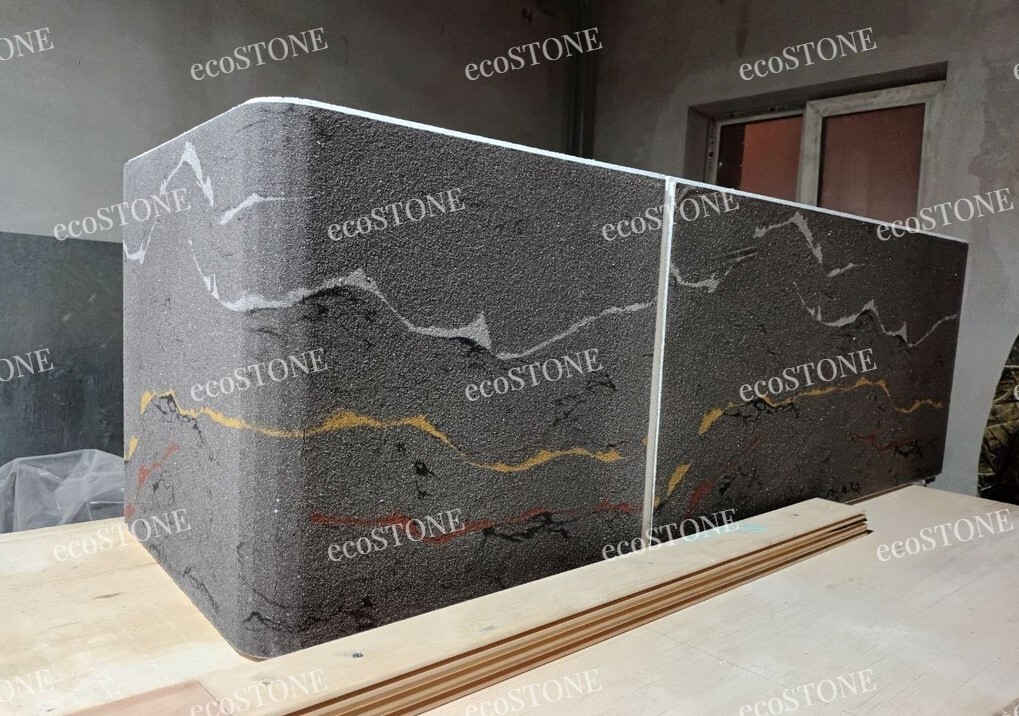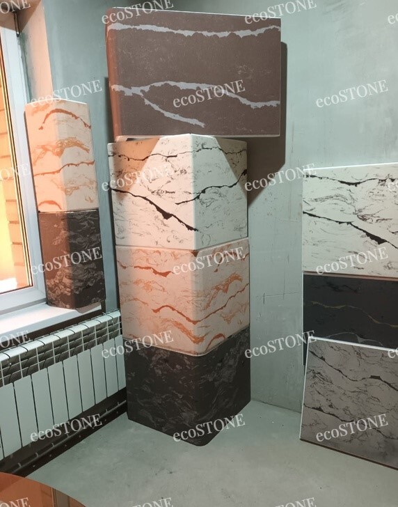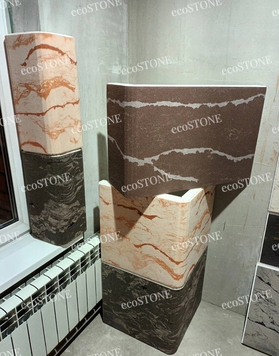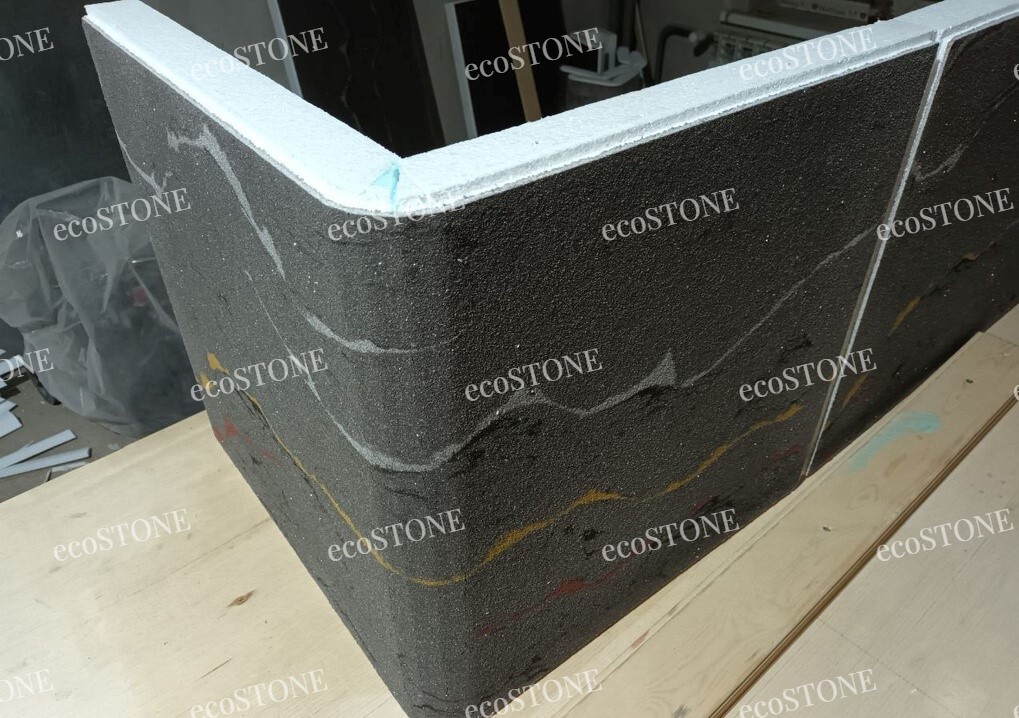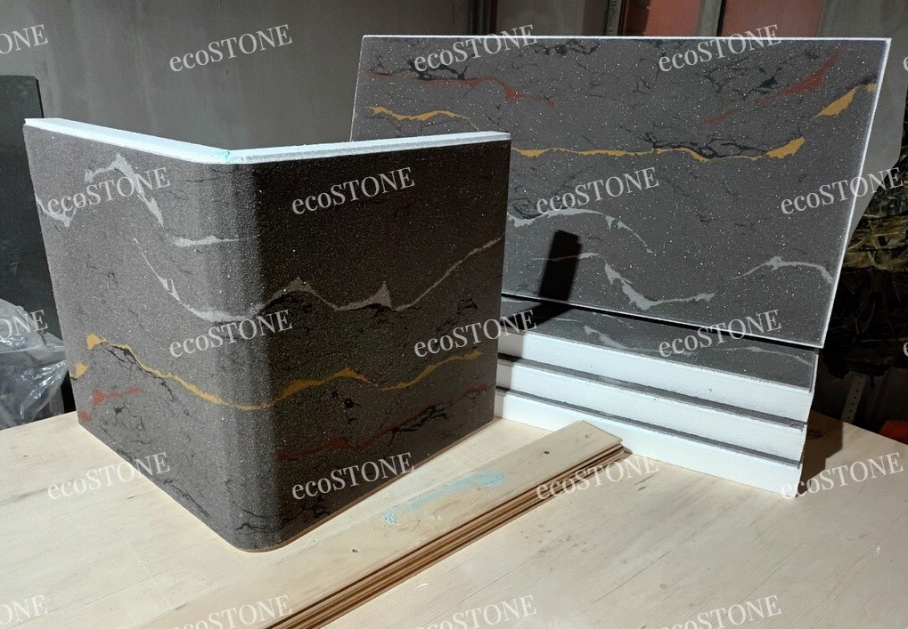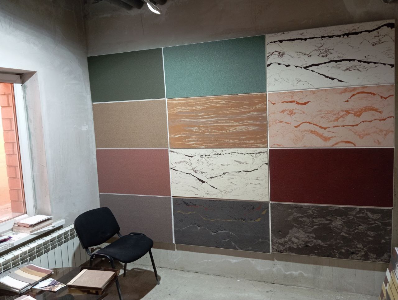 Гибкий камень представляет собой мраморную или кварцевую крошку, которую мы окрашиваем сухими пигментами и с помощью клеевого состава наносим на основу-стеклоткань. Термопанели – это все то же самое, только вместо стеклоткани используется жесткий утеплитель, например, минеральная плита или пенопласт.